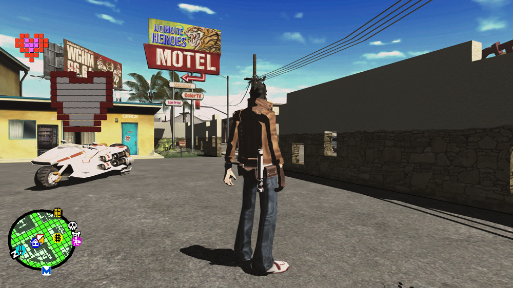 Suda projects a punk-attitude in all aspects of his game design, drawing from his love of early UK bands and their anti-establishment, DIY revolt to mainstream practice. It explodes onto the screen with a flurry of vibrant colour and highly detailed UI’s, experimenting with an array of art styles, such as cel-shading, pop-art and anime. A game like Flower, Sun, and Rain, permeate elements of Dadaism and challenge the idea of “fun,” as the player treks a mystified island with no transport or idea to go off, repeating the same day ad nauseam. But the clearest example of this punk approach is a refusal to one’s vision in favour of mainstream-appeal. A desire to create unique titles that embrace the nonsensical and provoke new experiences in the player, leading to destined cult-classics.