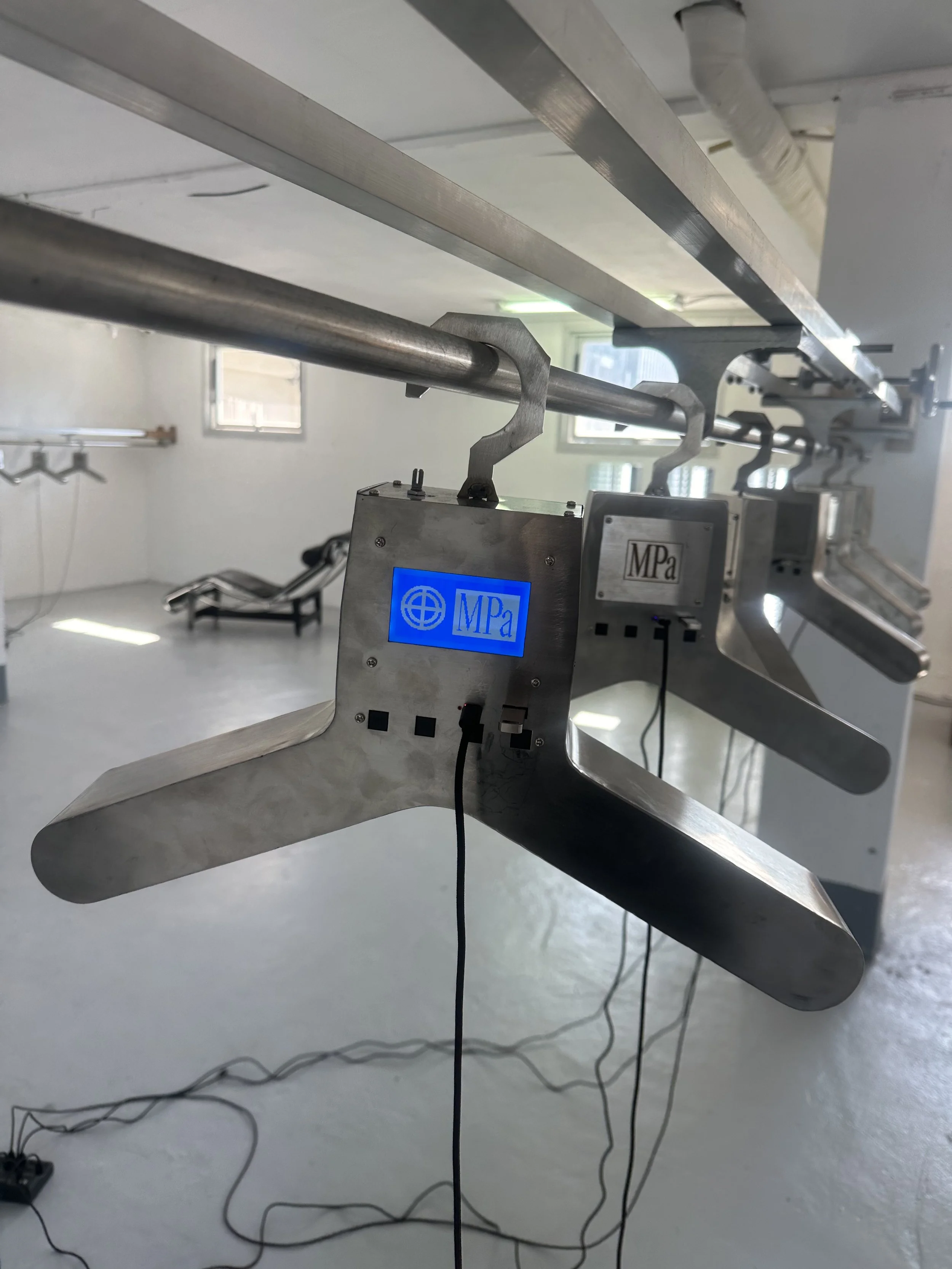 The same logic that destabilizes function at the level of the garment becomes something considerably more immersive when PLASTICPRODUCT moves into spatial and sensory territory, where the body is no longer just wearing the argument but inhabiting it. HANGING SOUND, conceived by Mincheol Seo and produced with SungHoon Kim and Teo Shin, makes this displacement most visceral, built around an object that merges a hanger with a speaker and selects steel as its primary material precisely because steel is what acoustic engineering has spent decades learning to eliminate from the signal chain, treating the distortion it introduces as a defect to be engineered around rather than a property worth taking seriously.